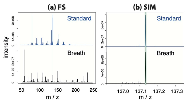 This study critically evaluates the accuracy of compound identification and quantification in SESI-MS breath analysis, comparing MS1-based methods to targeted MS2 techniques. Using C5–C10 aldehydes, limonene, and pyridine as known breath markers, researchers tested full scan, selected ion monitoring, and parallel reaction monitoring across 12 volunteers. While high-abundance VOCs like limonene and pyridine were reliably detected, low-abundance aldehydes posed significant challenges due to isomeric interference (e.g., from ketones), leading to misassignments—even with MS2. The study underscores the need for robust MS2 validation in SESI workflows to avoid false positives and ensure quantitative accuracy in clinical and diagnostic breath analysis.