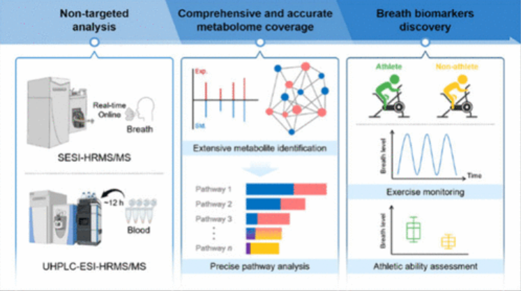 This study demonstrates how exhaled breath can complement blood in metabolomics by retaining volatile compounds often lost in blood analysis. Researchers combined a controlled exercise protocol, a custom breath metabolomics database, and metabolite fusion across breath and blood to boost identification accuracy. High-resolution MS revealed 66 unique breath metabolites, 59 unique blood metabolites, and only 4 shared. Integrating both matrices expanded pathway coverage and highlighted breath-specific markers of exercise-induced changes, paving the way for novel biomarkers and future smart wearable applications.