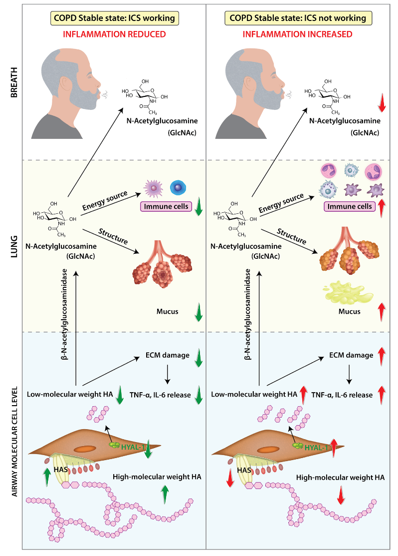 This study examined whether real-time breath analysis can detect metabolic changes during acute exacerbations of COPD (AECOPD) compared to the stable state in patients receiving triple inhaled therapy. Breath profiles from 28 patients revealed alterations in aminosugar, linoleate, and butanoate pathways. A prediction model discriminated AECOPD from stable state with high accuracy (AUC = 0.84, sensitivity and specificity 86%). These findings suggest that exhaled breath analysis may provide a rapid, non-invasive tool for detecting exacerbations and reveal aminosugar metabolism as a potential therapeutic target.
